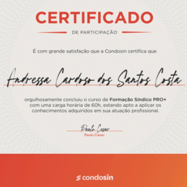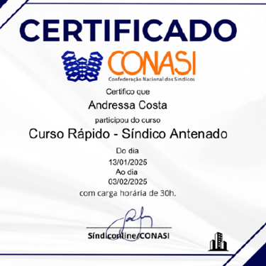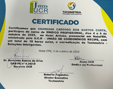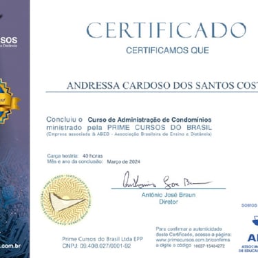 - Graduada no MBA em Gestão de Condomínios, Síndico Profissional e Direito Condominial.